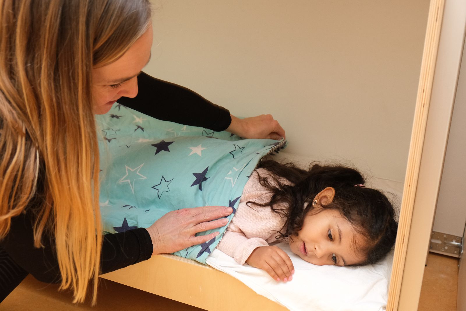 We volgen zoveel mogelijk het natuurlijke slaapritme van ieder kind. Vooral bij baby’s is slapen op verzoek belangrijk. Je kunt het slaappatroon van je kind met ons delen, zodat wij goed kunnen aansluiten. Samen zorgen we voor een veilige, rustige en vertrouwde omgeving waarin jouw kind heerlijk kan slapen.